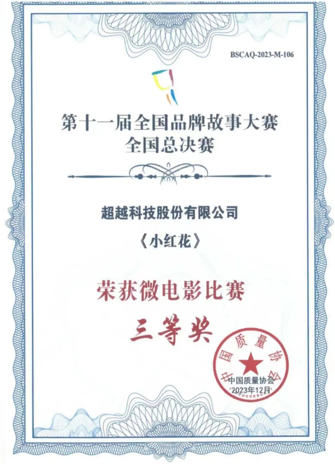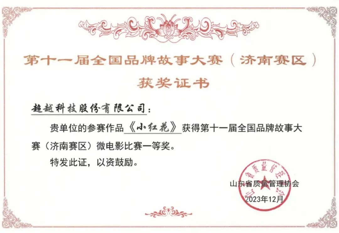 近日,由中國質(zhì)量協(xié)會主辦的2023年品牌創(chuàng)新大會暨第十一屆全國品牌故事大賽全國總決賽圓滿落幕。超越科技“打造以泰山精神為主導的超越特色品牌責任文化”榮獲2023年中國企業(yè)品牌創(chuàng)新成果、山東省企業(yè)品牌創(chuàng)新成果一等獎,微電影《小紅花》榮獲第十一屆全國品牌故事大賽全國總決賽三等獎、濟南賽區(qū)一等獎。